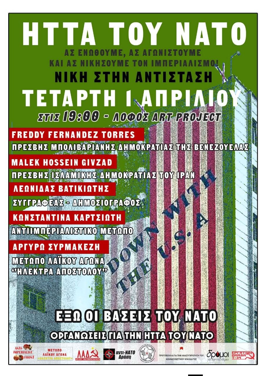 Εκδήλωση ενόψει της διεθνής αντιιμπεριαλιστικής κινητοποιήσης της 4ης Απρίλη, τη μέρα ίδρυσης του ΝΑΤΟ.